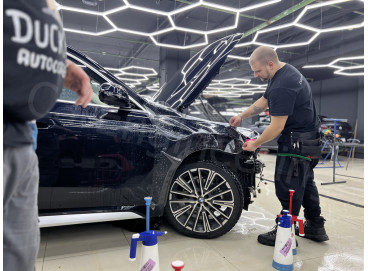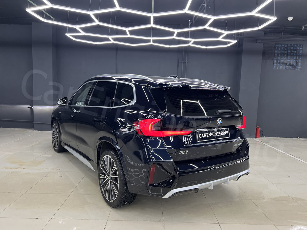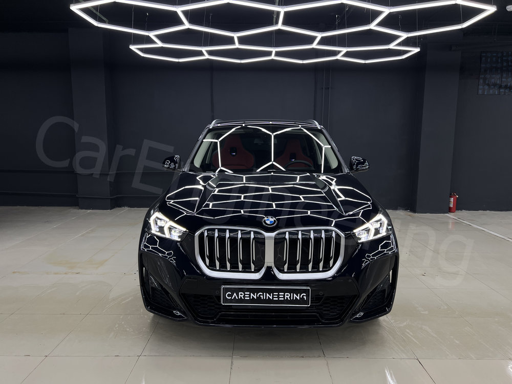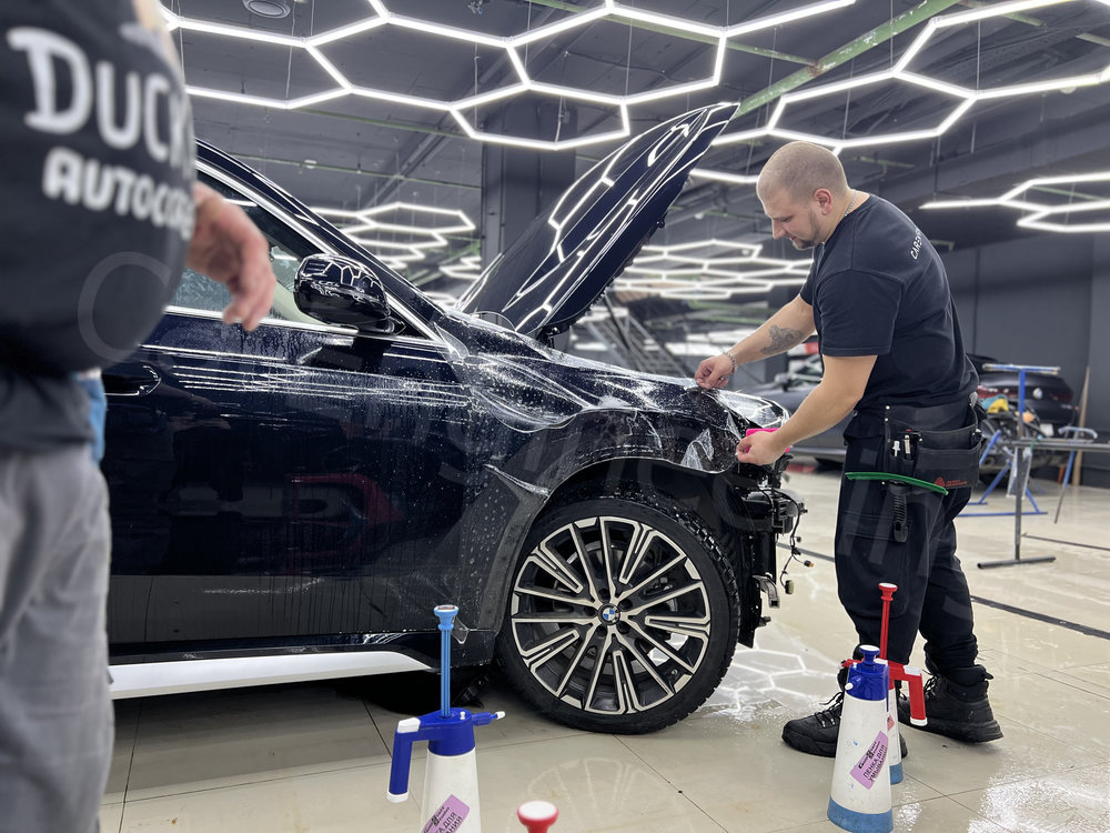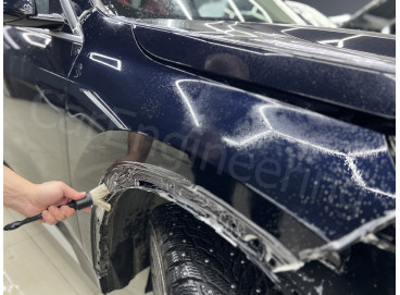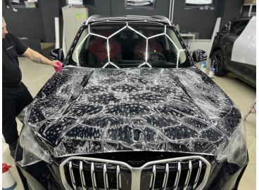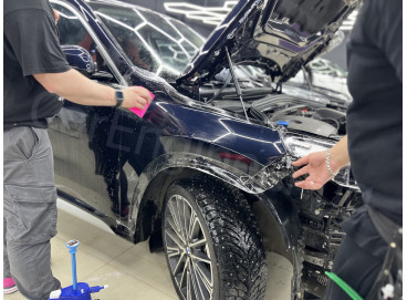 Керамику также называют жидким стеклом, которое наносится на ЛКП и полимеризуется, образуя тонкое защитное покрытие. Оно отлично работает с внешним видом автомобиля: усиливает глянец, придает поверхности выраженные гидрофобные свойства и замедляет выгорание цвета. За счет этого неоклеенные детали визуально не выделяются на фоне элементов, защищенных пленкой, поэтому кузов выглядит целостно. При этом керамика не может полностью заменить полиуретановую пленку. Из-за минимальной толщины слоя она послужит хорошей защитой кузову BMW X1 только при малых воздействиях — микроцарапинах или легких потертостях. Также керамику нужно гораздо чаще менять, чем полиуретан — каждые 12 месяцев. Хоть материал и дешевле пленки, это не всегда играет автовладельцу на руку. Из года в год он обновляет покрытие, но часто получается так, что машина изнашивается практически так же, как это было и без покрытия.